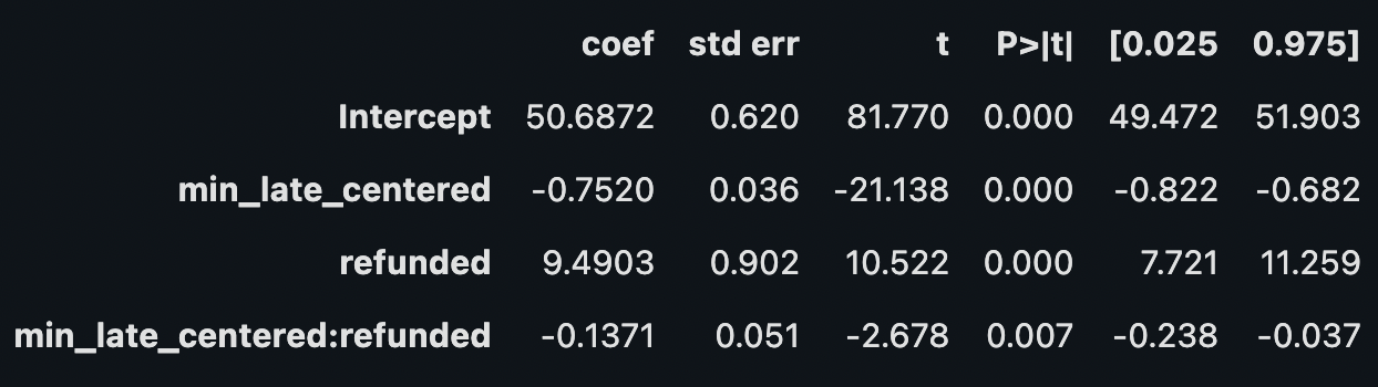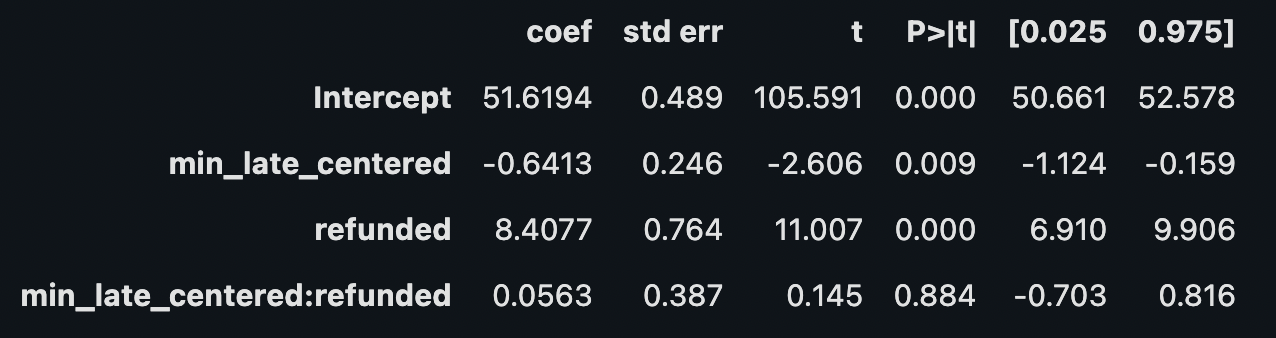model_all_data = smf.wls("ltv ~ min_late_centered * refunded", df_late).fit()