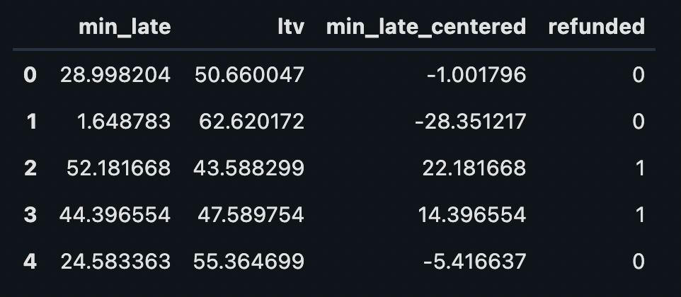 "ltv ~ min_late_centered * refunded",